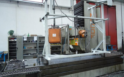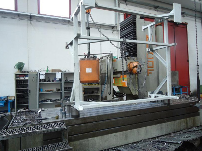 Fresatrice alesatrice Mecof a montante mobile con piani stolle e testa birotativa il tutto a CNC.